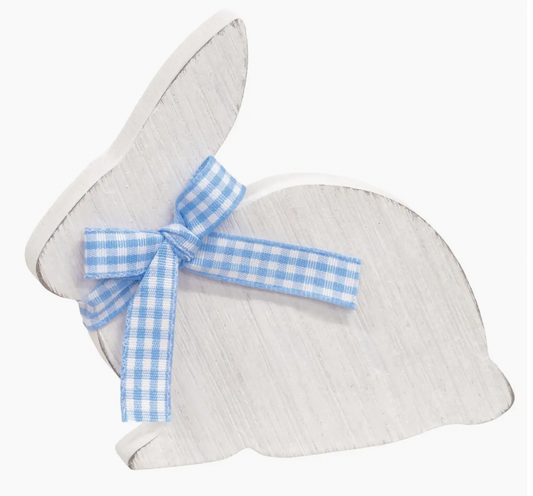 White Bunny Sitter W/Blue & White Buffalo Check Ribbon
