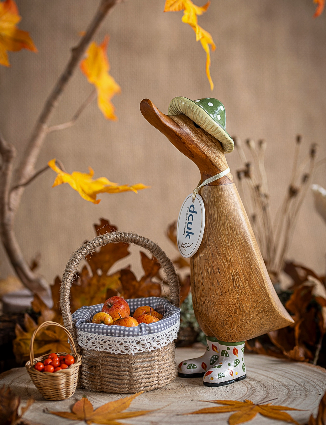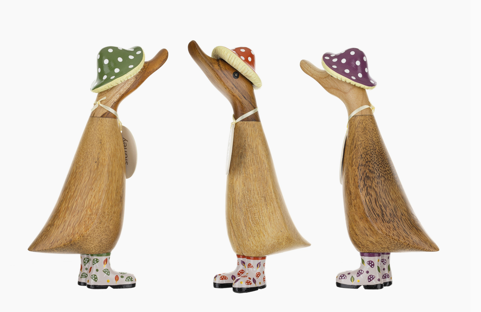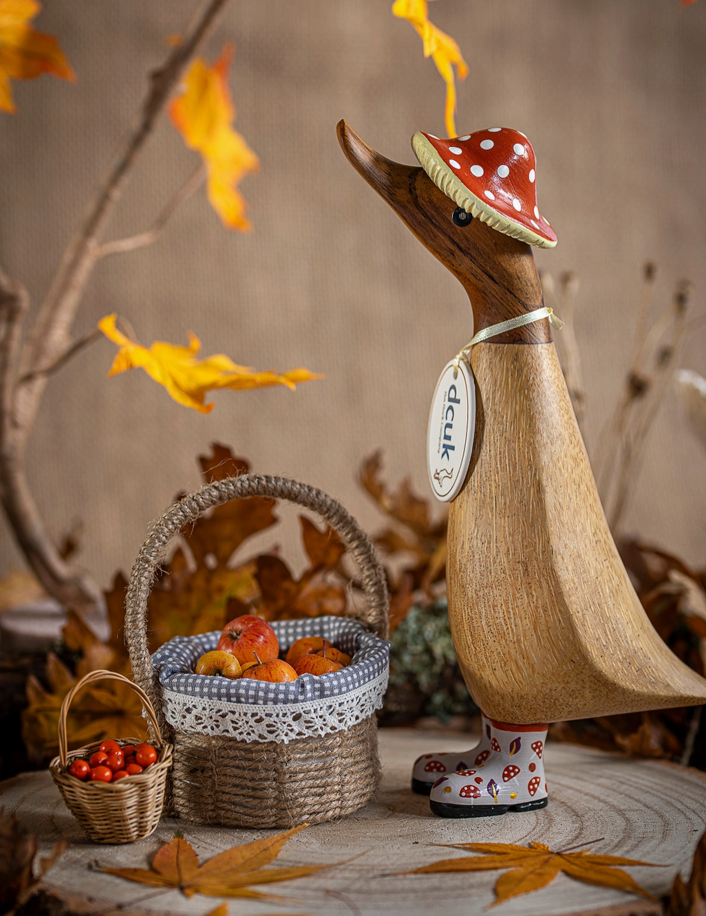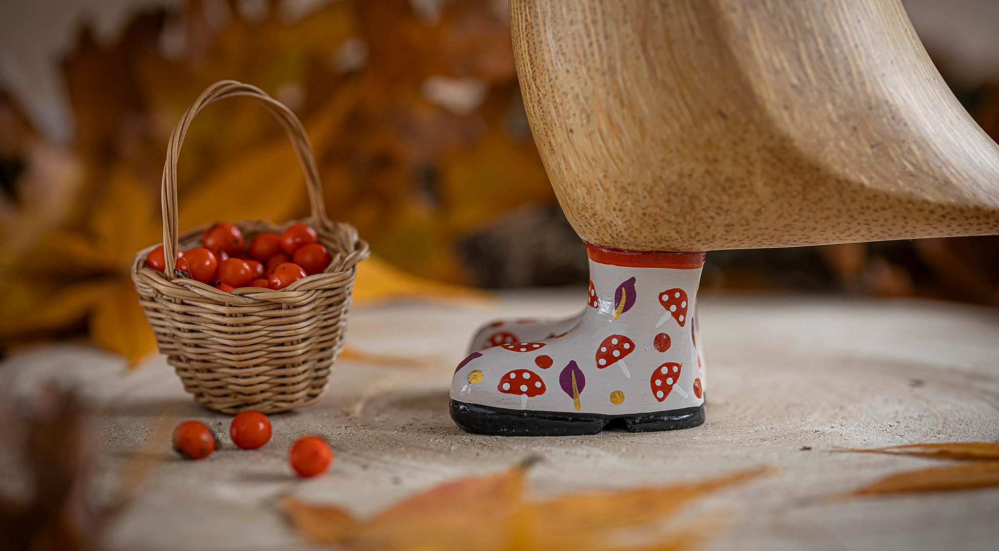 Handcrafted toadstool hats and boots, painted in gorgeous green, orange, and purple transform a woodland walk into a duckling playtime.