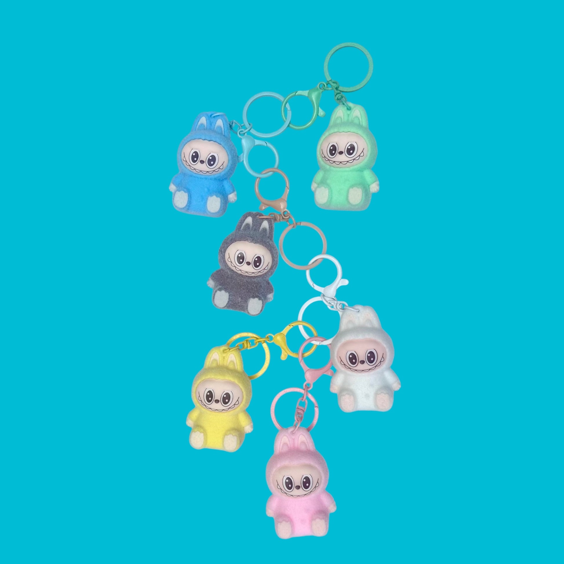 These adorable flocked Labubu bunny figurine key chains come in a variety of vibrant colors, each featuring a soft, velvety texture and a charming smiling face.