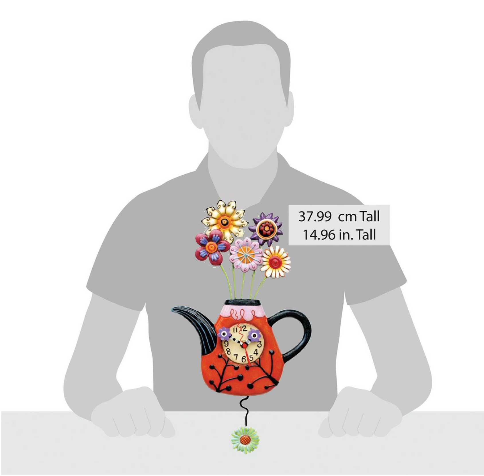 This colorful clock is a functional and funky piece of wall decor. With quirky flower hands and whimsical blooms, this timepiece keeps time with intrigue. In the shape of a watering can, the clock spouts flowers and a ticking pendulum of petals.