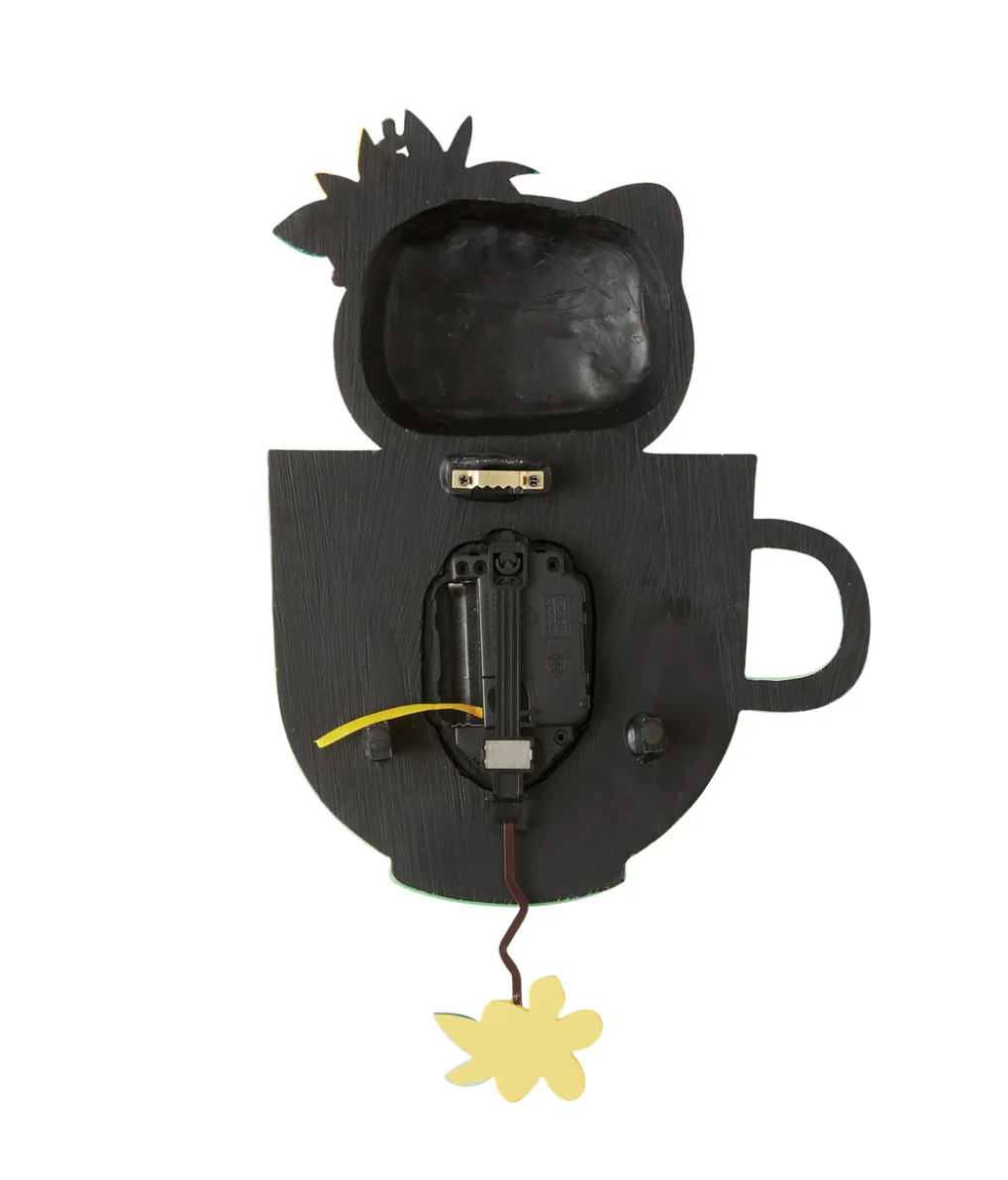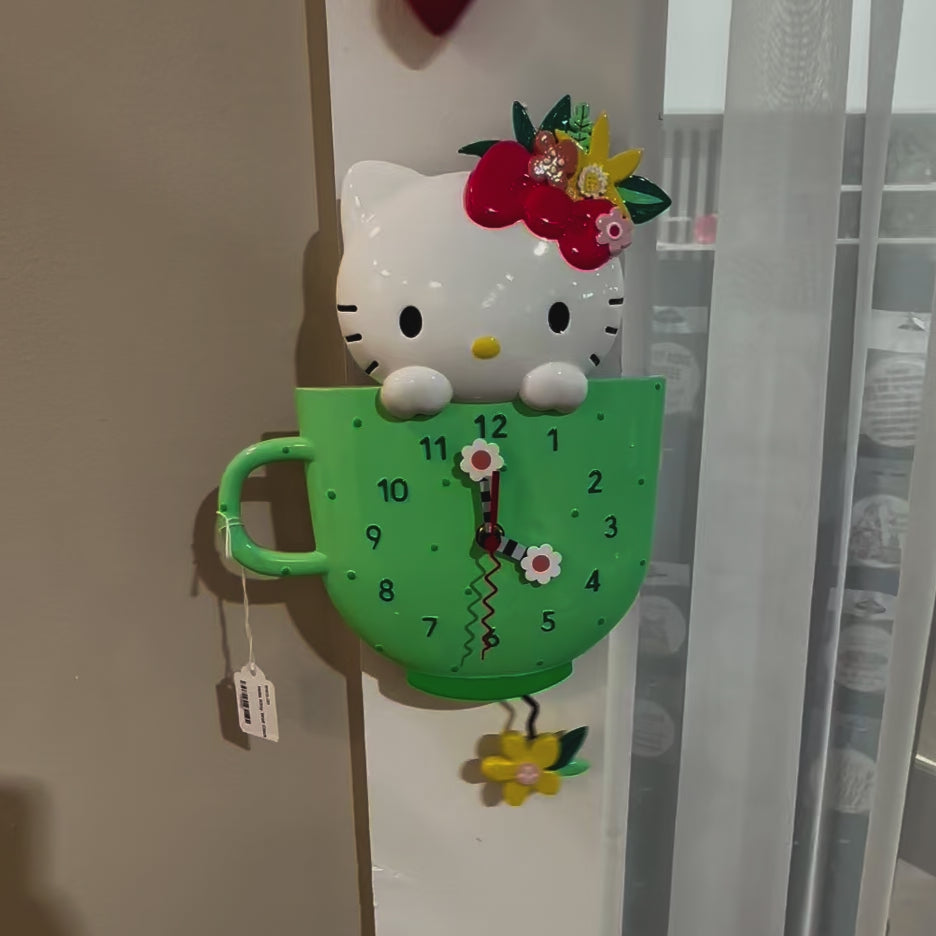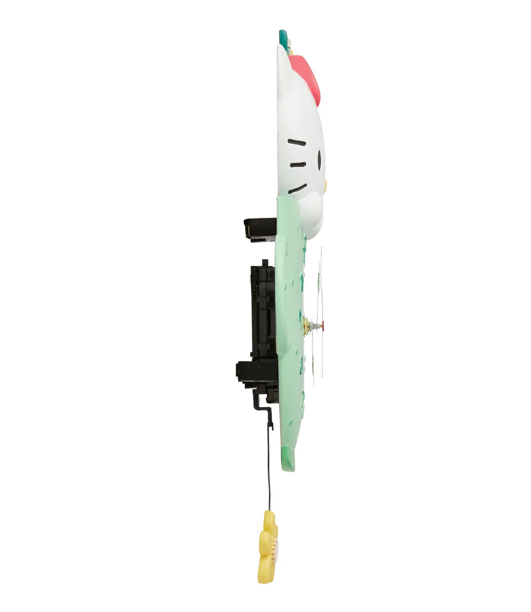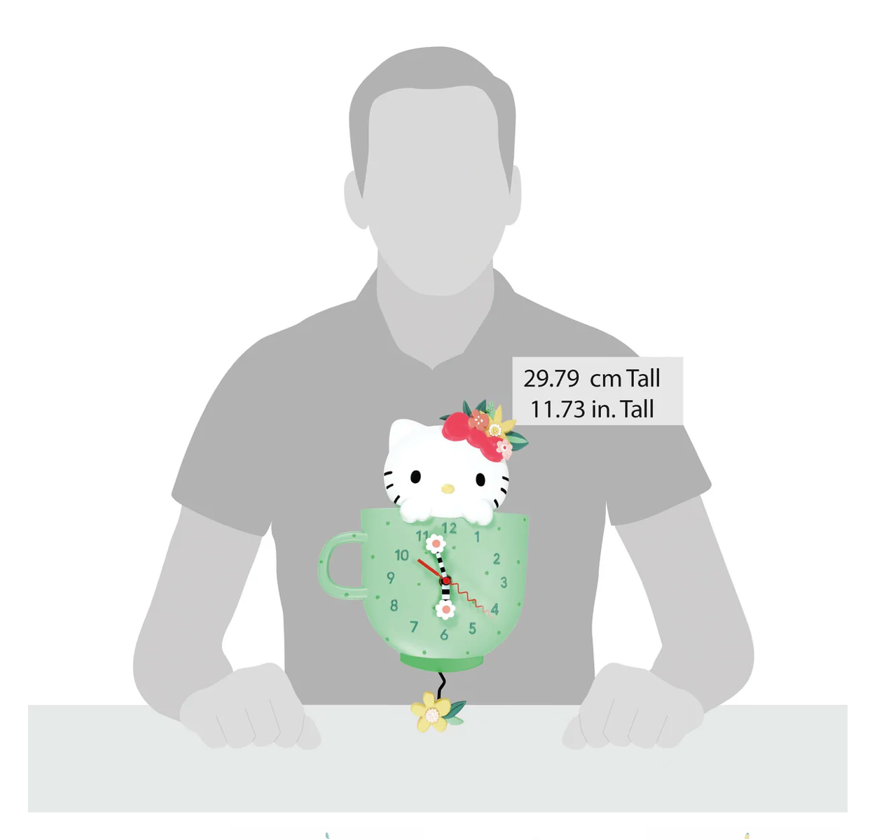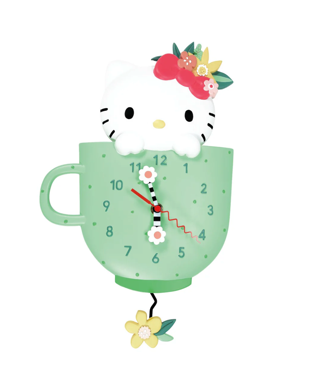 Keep time in Sanrio style with Hello Kitty! Peeking out of a green tea cup, Hello Kitty wears flowers tucked behind her iconic pink bow. This curious cat clock helps you plan your day with ticking flower hands and swinging pendulum.