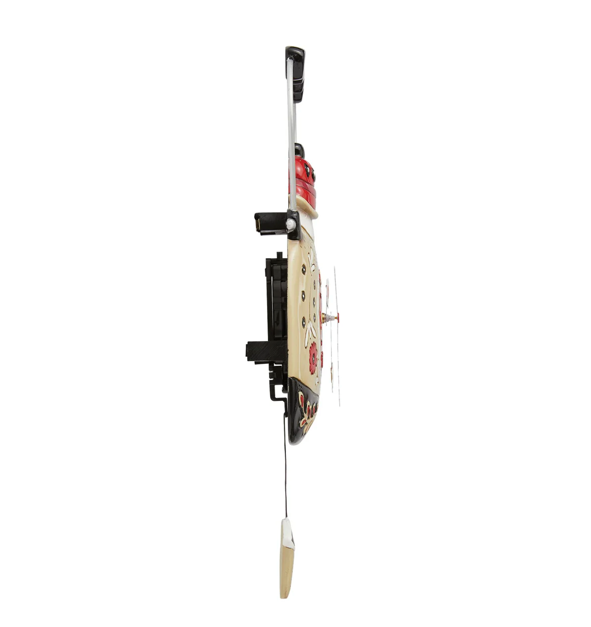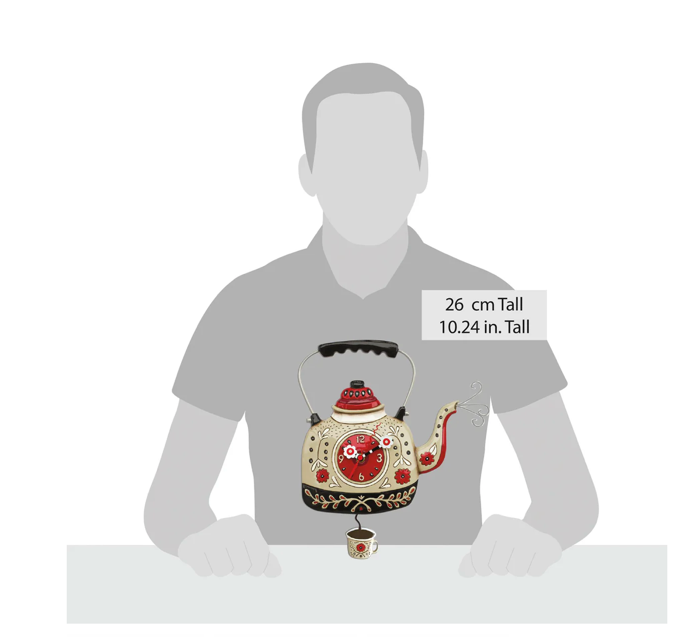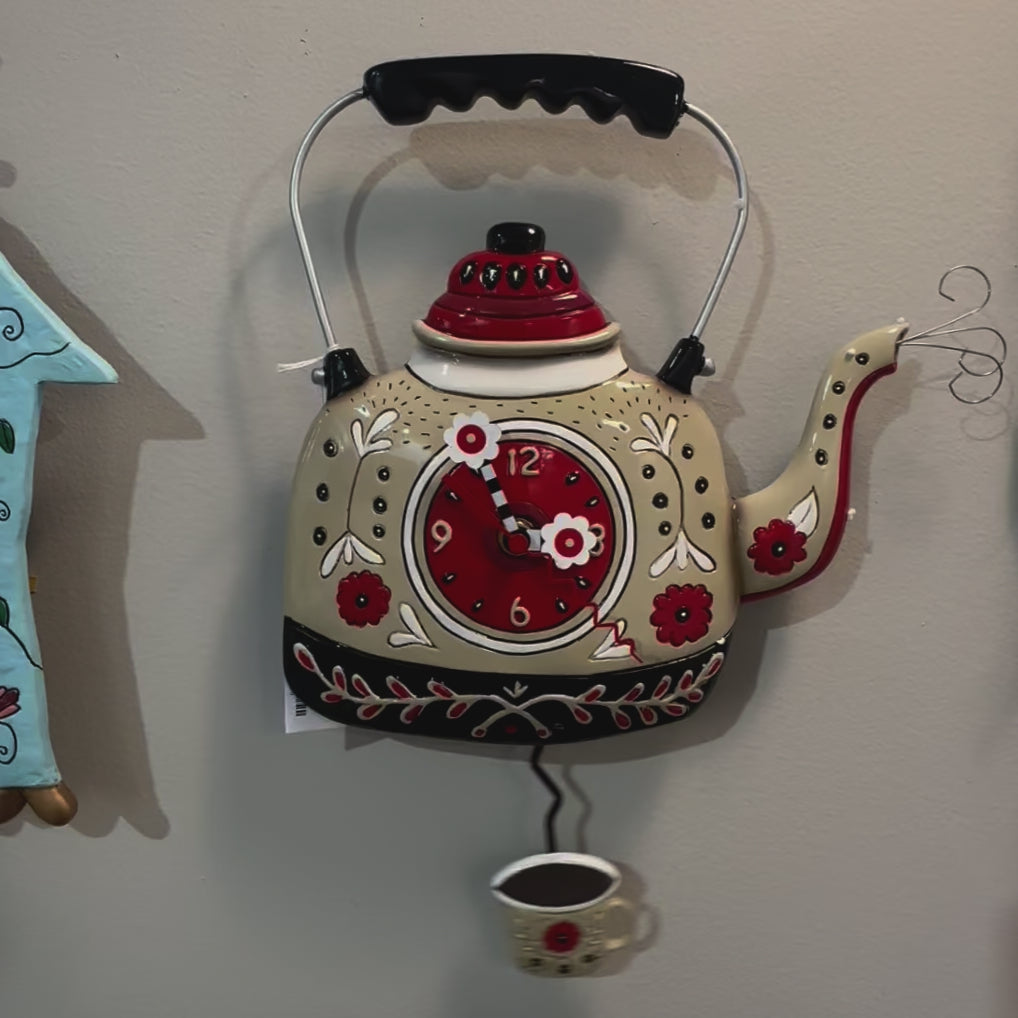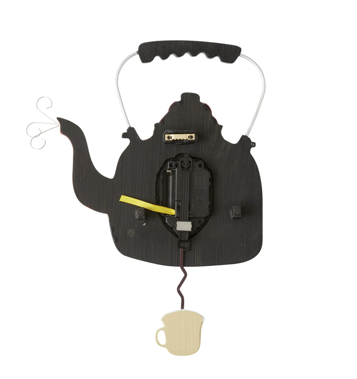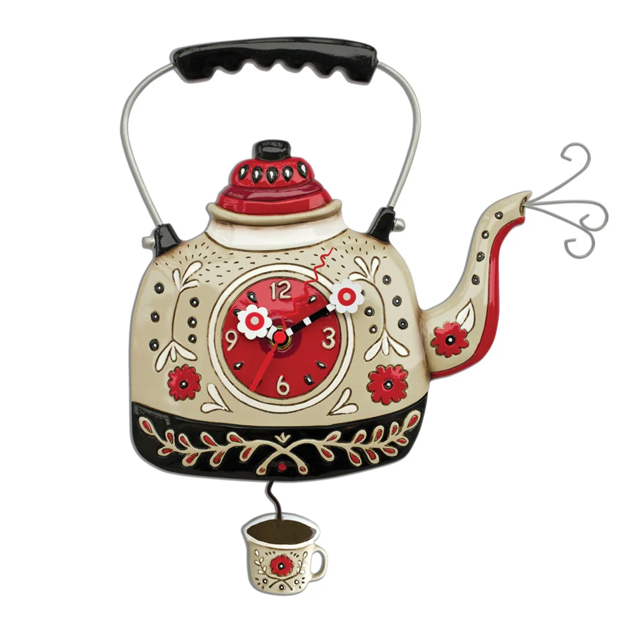 This charming wall clock is in the shape of a floral teakettle. With flower clock hands a a ticking cup of tea pendulum, this unique clock delights with functional fun. With delicate petal patterning and colorful detail, keep time in steamy style!