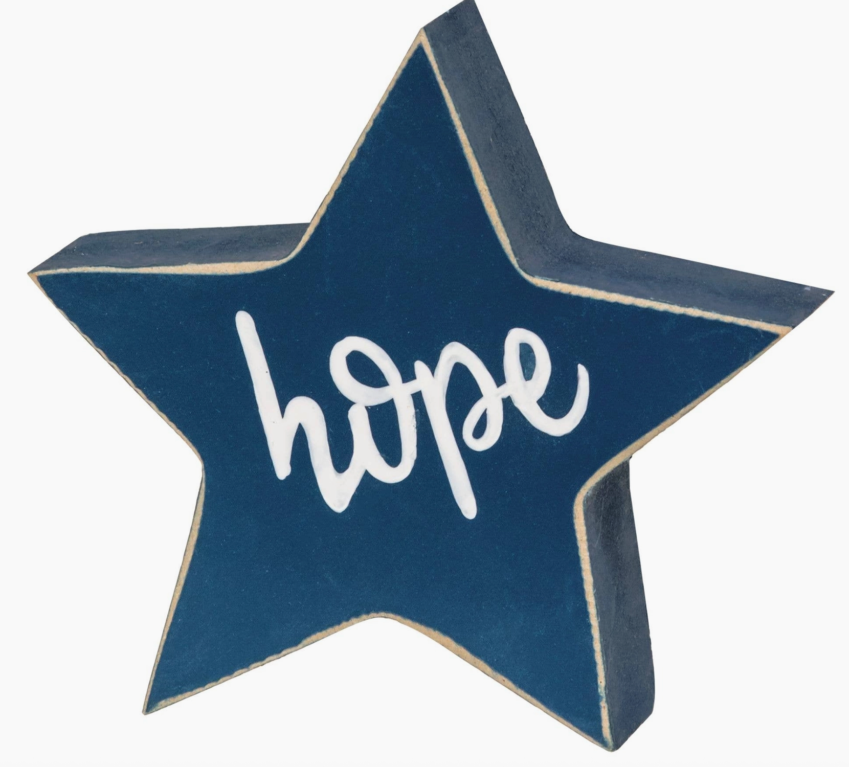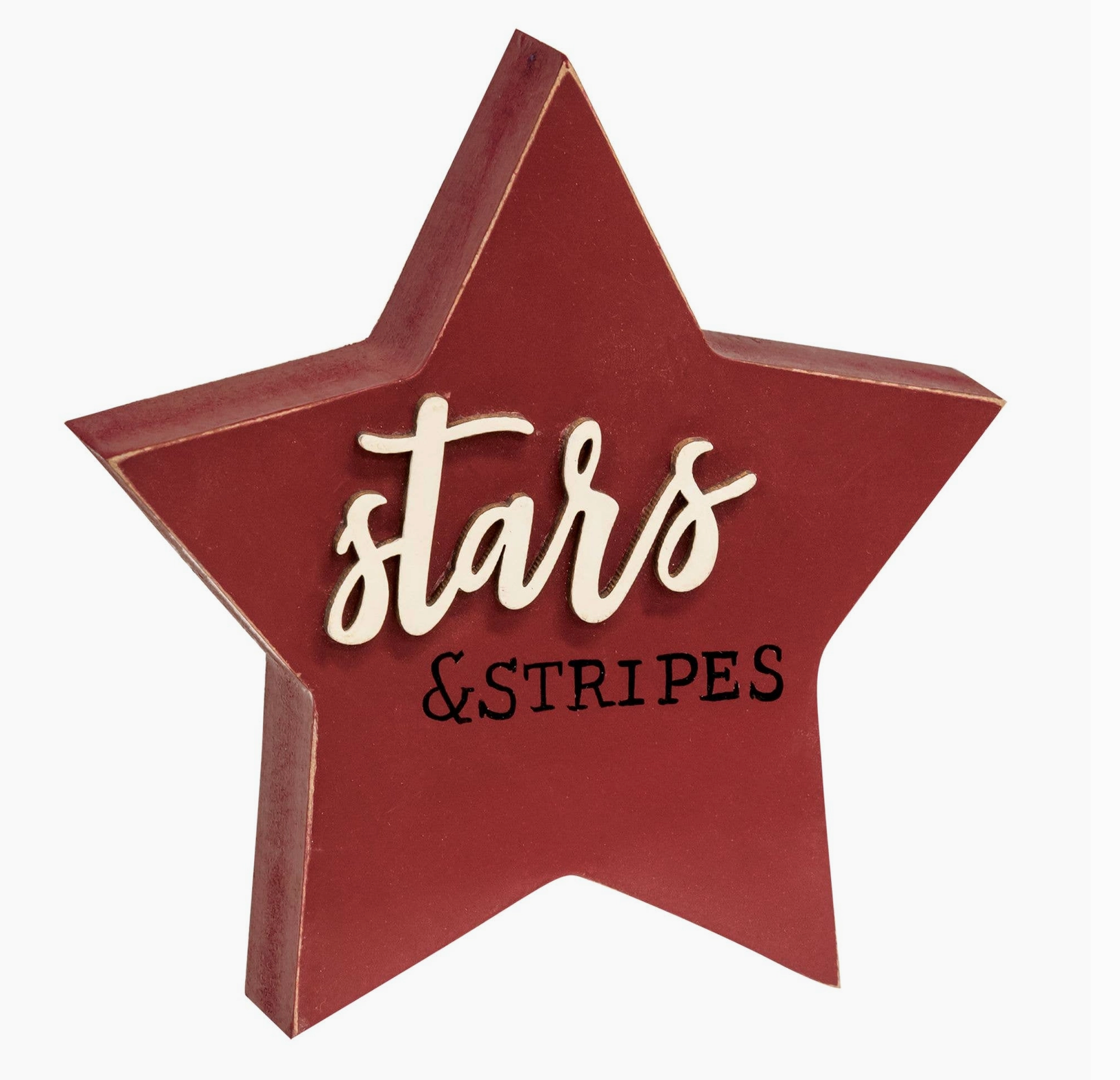 Stars & Stripes Chunky Sitters sells as an assortment of three wooden stars. Sitter is freestanding with a red, blue, or red, white, and blue finish and it reads, "stars stripes," or, "hope" in bold text. Measures 5" in diameter by 1"deep (red); 4" in diameter by 1" deep (blue); 4.5" in diameter by 1" deep (red, white, blue).