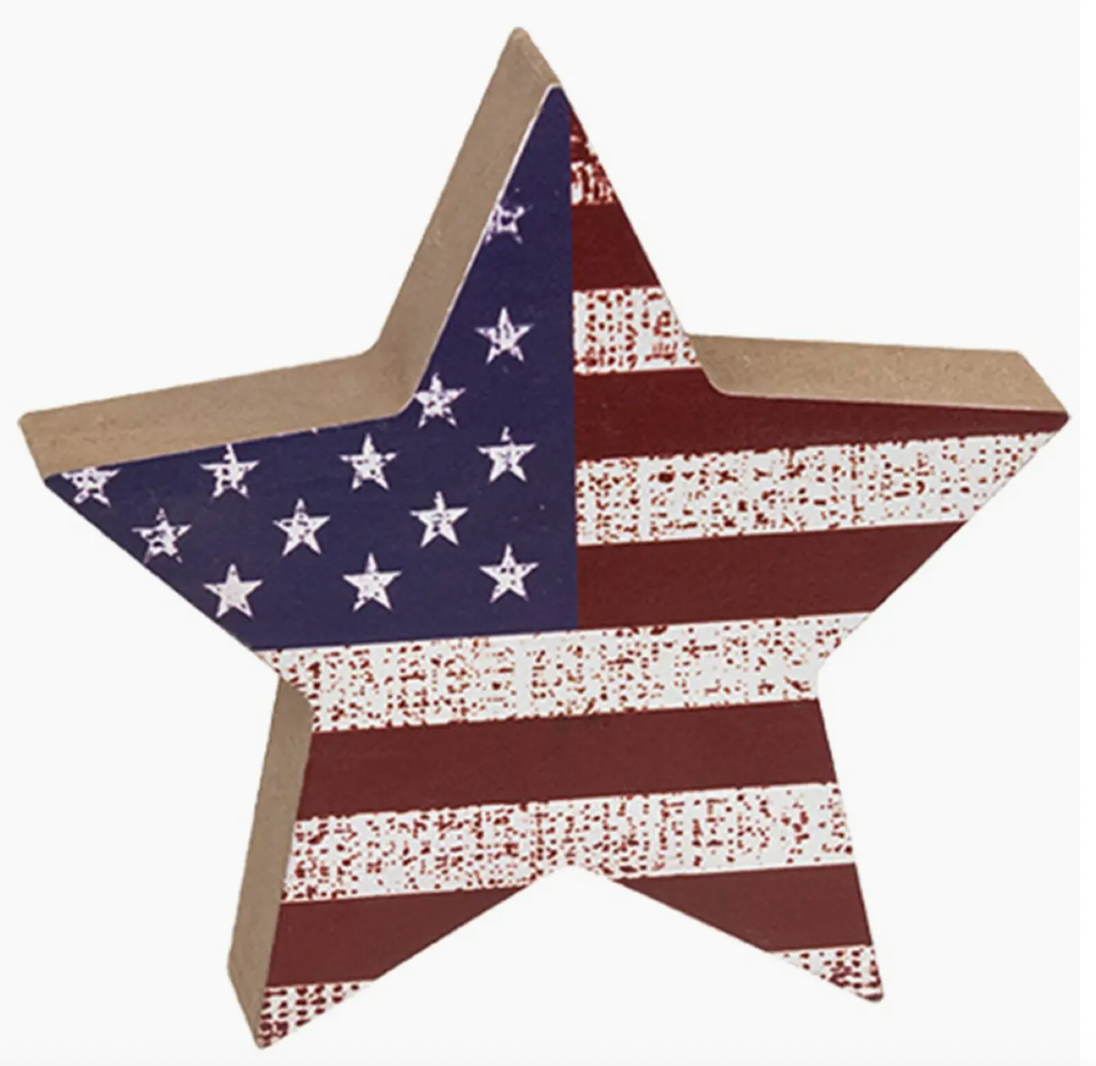 The USA Flag Star is a chunky wooden cutout decoration in the shape of a five-point star. The star displays the red, white, and blue stars and stripes of the American flag, making this block perfect for a patriotic Americana theme. Display this star freestanding on any shelf, tabletop, riser, tiered tray, or other flat surface. Measures 4.5” in diameter and 1” deep.
