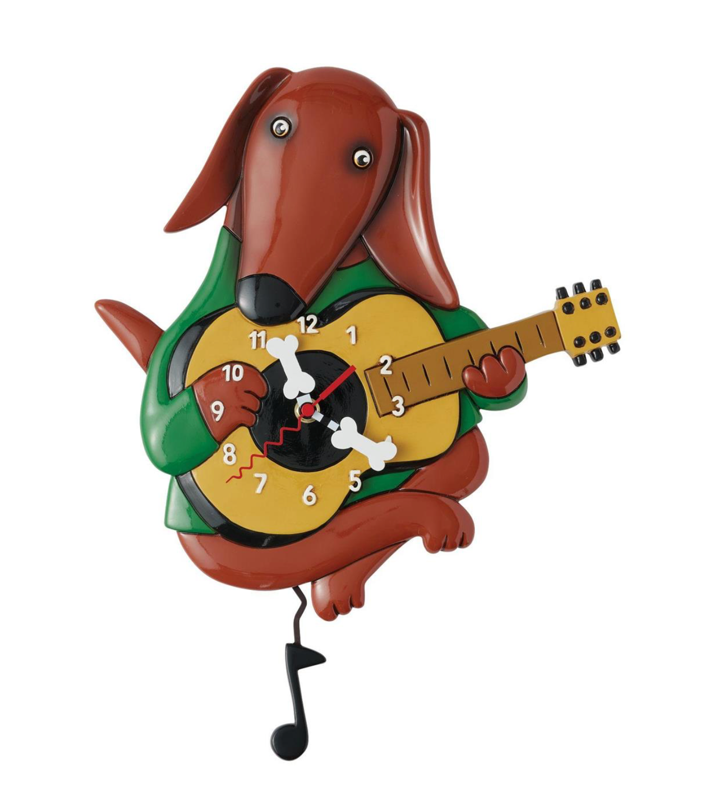 Strike a chord of whimsy with the Barkoustic wall clock by Allen Designs, featuring a talented dog strumming an acoustic guitar. With dog bone clock hands and a music note pendulum, this playful timepiece is perfect for music and dog lovers alike!