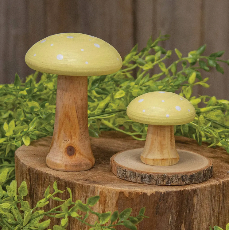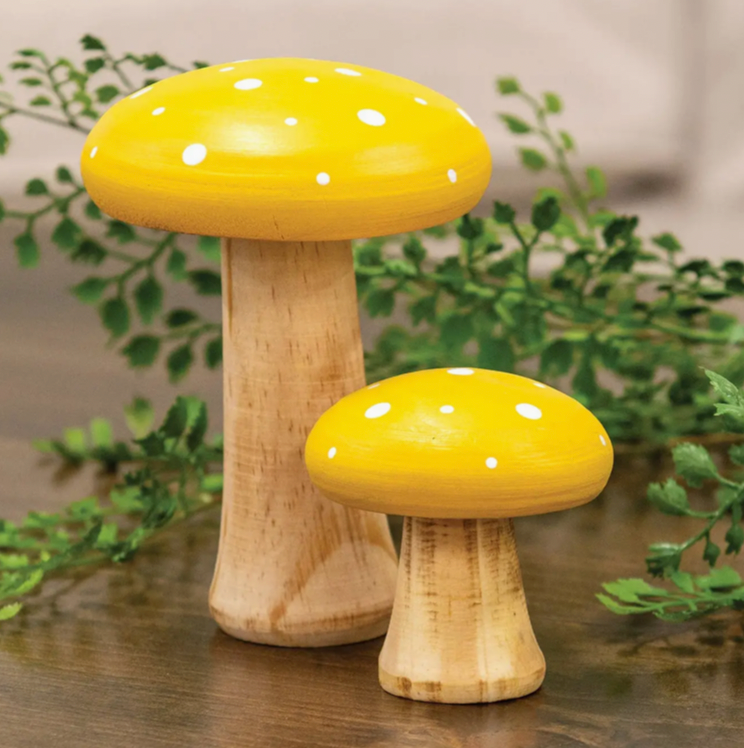 Cap-off springtime farmhouse displays with the White Dotted Blue Wood Mushrooms set. This pair of solid wood mushrooms feature a natural wood-tone base and are topped off with light blue caps accented with white dots. One mushroom measures 3.5" in diameter and 4.75" high. The other measures 2.5" in diameter by 2.5" high. These mushrooms will make a vibrant accent for a variety of springtime displays and look great paired with other cottage and garden-themed decor.